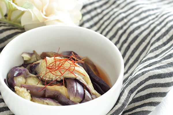 Món cà tím hấp là món ăn điển hình. Để cho những miếng cà tím đã hấp chín hơi nguội, cho tỏi băm, rau ngò rí và hành lá cắt nhỏ, dầu mè, giấm và đường vào chung tạo thành hỗn hợp để làm nước sốt, sau đó trộn đều với cà tím.