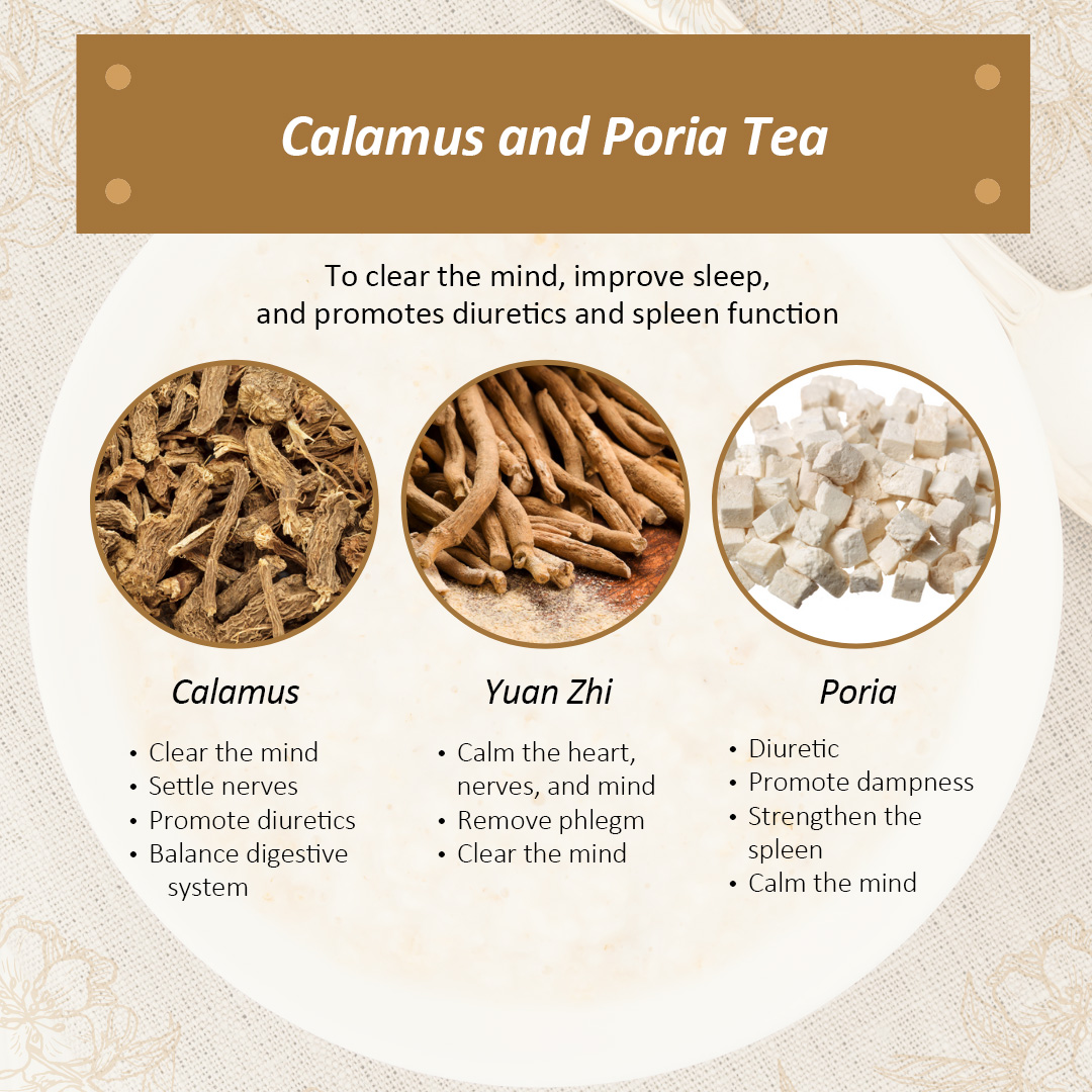Cây xương bồ giúp trí óc minh mẫn, loại bỏ thấp (ẩm), làm dịu cơn đau dạ dày. Bạch phục linh trợ có tác dụng kích thích quá trình lọc [ở thận] và lợi tiểu, bổ tỳ, làm dịu tâm trí, tiêu đờm và giúp trí óc minh mẫn.