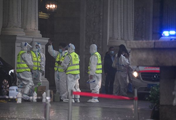 Vào ngày 29, xuất hiện một số nhân viên y tế mặc thiết bị bảo hộ ở lối vào khách sạn Legend ở khu mua sắm Vương Phủ Tỉnh, Bắc Kinh.