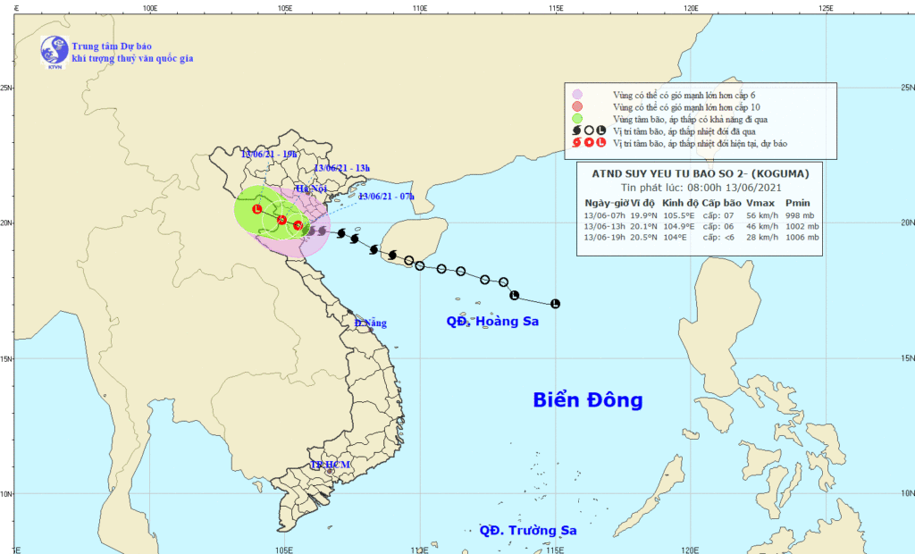 Đến 07h ngày 13/6, vị trí tâm áp thấp nhiệt đới ở khoảng 20.1 độ Vĩ Bắc; 106.2 độ Kinh Đông, ngay trên khu vực đồng bằng Bắc Bộ và Thanh Hóa với sức gió mạnh cấp 7 (60-75 km/giờ), giật cấp 9 vùng gần tâm áp thấp nhiệt đới.