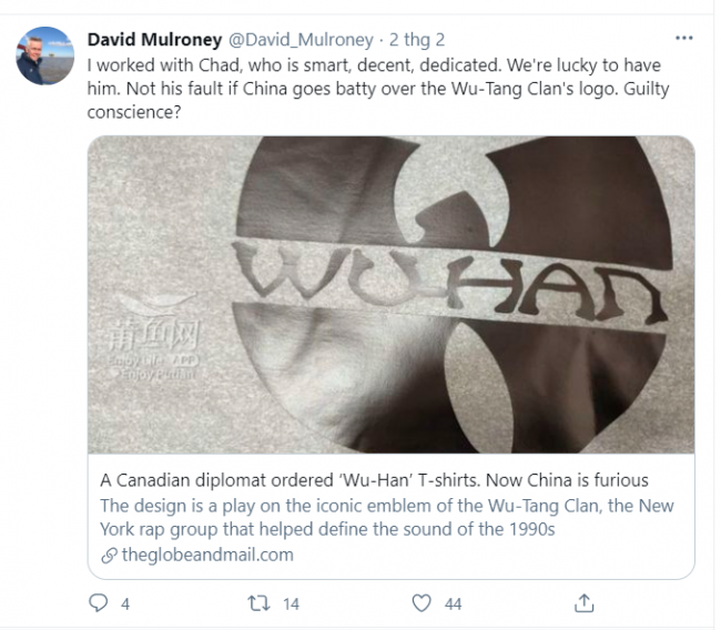 Tuy nhiên, cựu Đại sứ Canada tại Trung Quốc, ông David Mulroney đã viết trên Twitter: “Tôi đã làm việc với Chad, một người thông minh, đàng hoàng và tận tụy. Chúng tôi thật may mắn khi có được anh ấy. Không phải lỗi của anh ấy nếu Trung Quốc phản ứng kỳ cục về logo của Wu-Tang Clan. Lương tâm cắn rứt ư? ”