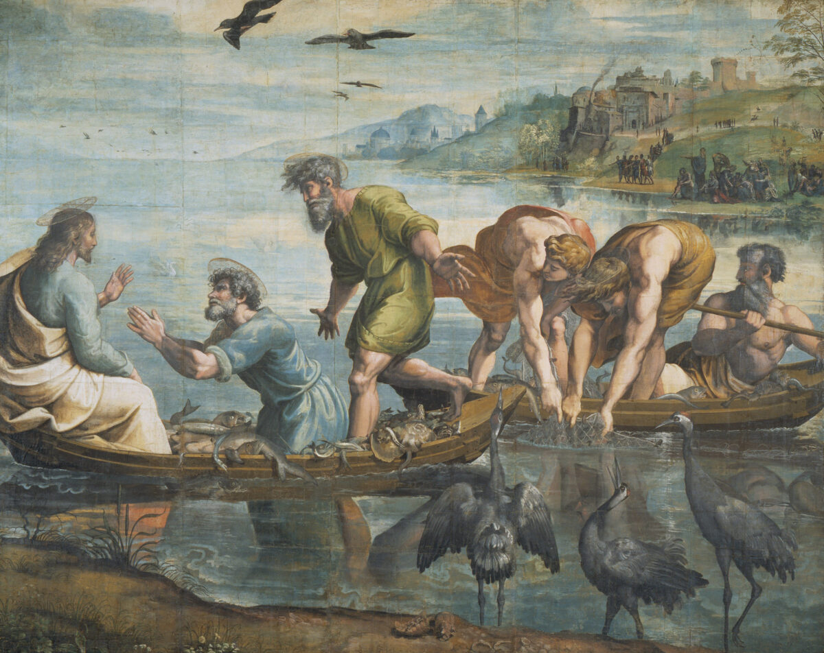 Bức phác thảo “Phép lạ bắt cá,” mô tả khung cảnh những người đàn ông đang đánh cá ở Hồ Gennesaret (còn được gọi là Biển Galilee hoặc Biển Tiberia). Họ đang chở rất nhiều loại hải sản như cá mòi, cá chình, tôm cua và cá mập trên thuyền. Có một quạ bay trên đầu, một điềm báo khủng khiếp về tội lỗi của con người; và những con sếu đang ở trên bờ. Chúa Giêsu, Peter và Andrew, anh trai của Peter, tất cả đều xuất hiện với ánh hào quang trên đỉnh đầu. Theo phân đoạn Kinh thánh, Chúa Giêsu đưa tay ra và nói, “Đừng sợ; từ nay về sau, ngươi sẽ bắt loài người.”