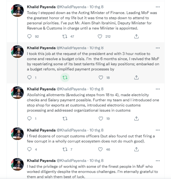 Phát ngôn viên Bộ Tài chính Mohammad Rafi Tabe nói với Bloomberg News rằng ông Khalid Payenda đã “từ chức và rời khỏi đất nước vì Afghanistan đang phải vật lộn với tổng thu nhập sụt giảm sau khi các vị trí hải quan bị tiếp quản.”
