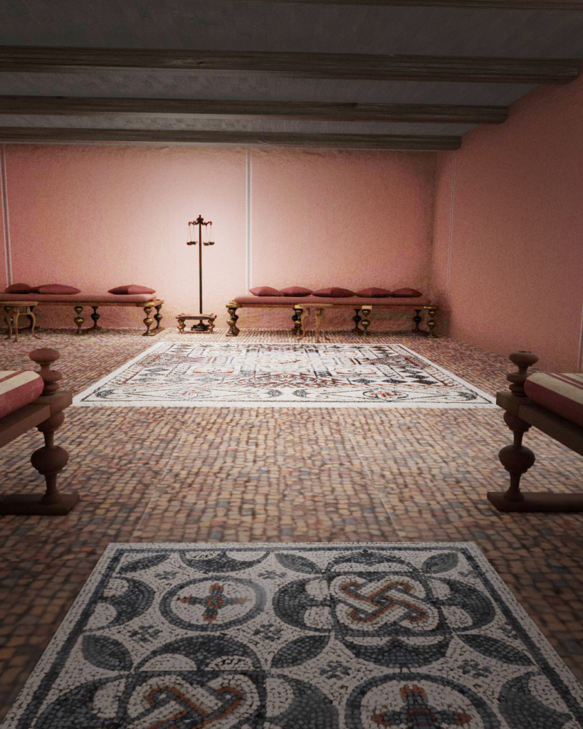 Dưới đây là bản tái tạo 3D của một nghệ sĩ về căn phòng dựa trên một mẫu khảm được khai quật, mô phỏng dinh thự và bức tranh khảm có thể trông như thế nào vào khoảng 1,800 năm trước: