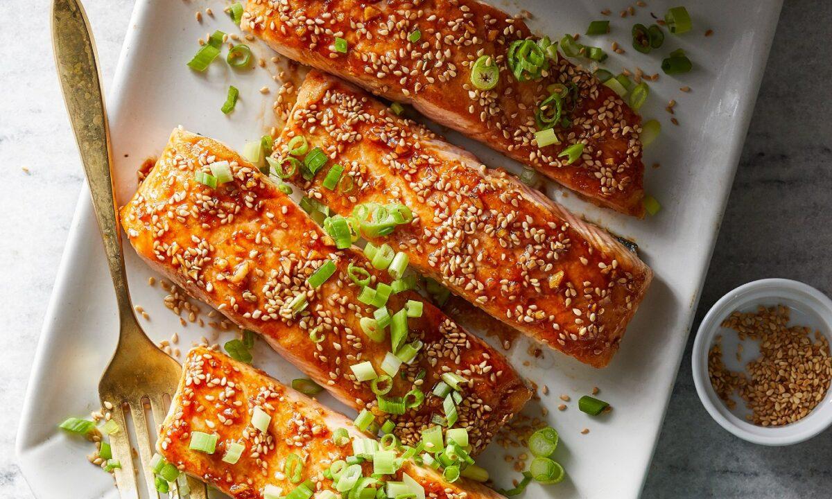 Những hạt mè hòa trộn trong nước sốt ngọt ngào phủ đều trên lát cá hồi làm tăng thêm hương vị hấp dẫn cũng như vẻ ngoài bắt mắt. Khi cho cá hồi vào lò nướng xong, nước sốt đặc lại và biến thành màu mứt vàng.