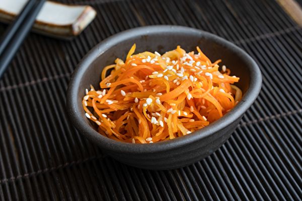Dùng dụng cụ gọt vỏ để bào cà rốt thành từng sợi rộng 1cm, cho hỗn hợp các loại gia vị vào tô, rồi cho dầu ô liu vào trộn đều, sau đó cho cà rốt bào sợi vào đảo đều.