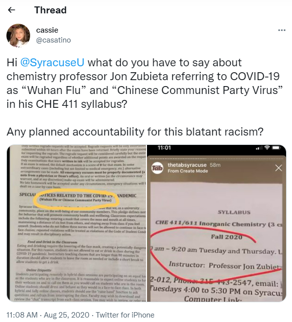 Giáo sư Zubieta hiểu rất rõ rằng một bài luận “không hợp ý” có thể ảnh hưởng đến sự nghiệp như thế nào. Hồi tháng 08/2020, giáo sư Zubieta bị đình chỉ công việc giảng dạy sau khi sinh viên phàn nàn về việc ông sử dụng các thuật ngữ như “Cúm Vũ Hán” và “Virus Trung Cộng” trong giáo trình của mình. Hiện ông đã quay trở lại làm việc.
