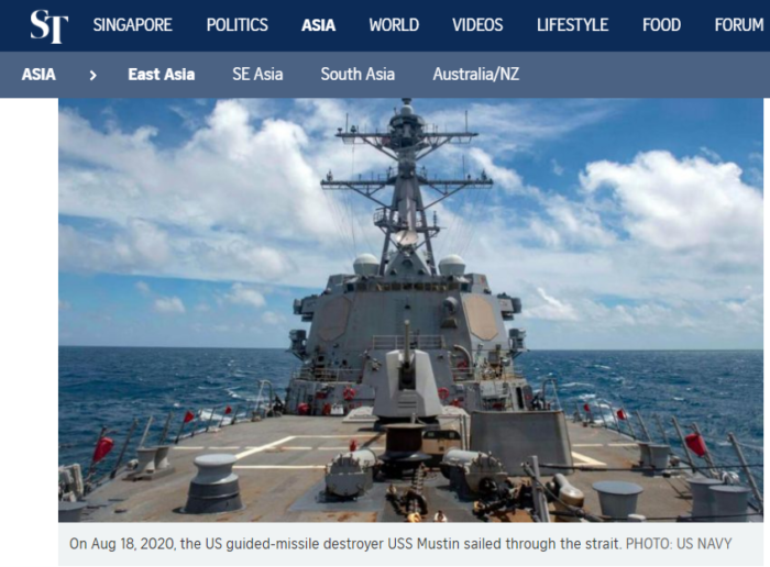 Trước đó, ngày 18/8, tàu khu trục USS Mustin của Mỹ đã đi qua eo biển trên. Sau đó, quân đội Trung Quốc chỉ trích, đó là một động thái “cực kỳ nguy hiểm”. Thời gian qua Trung Quốc và Mỹ đều gia tăng hoạt động quân sự tại khu vực, ở cả vùng biển gần Đài Loan và Biển Đông.