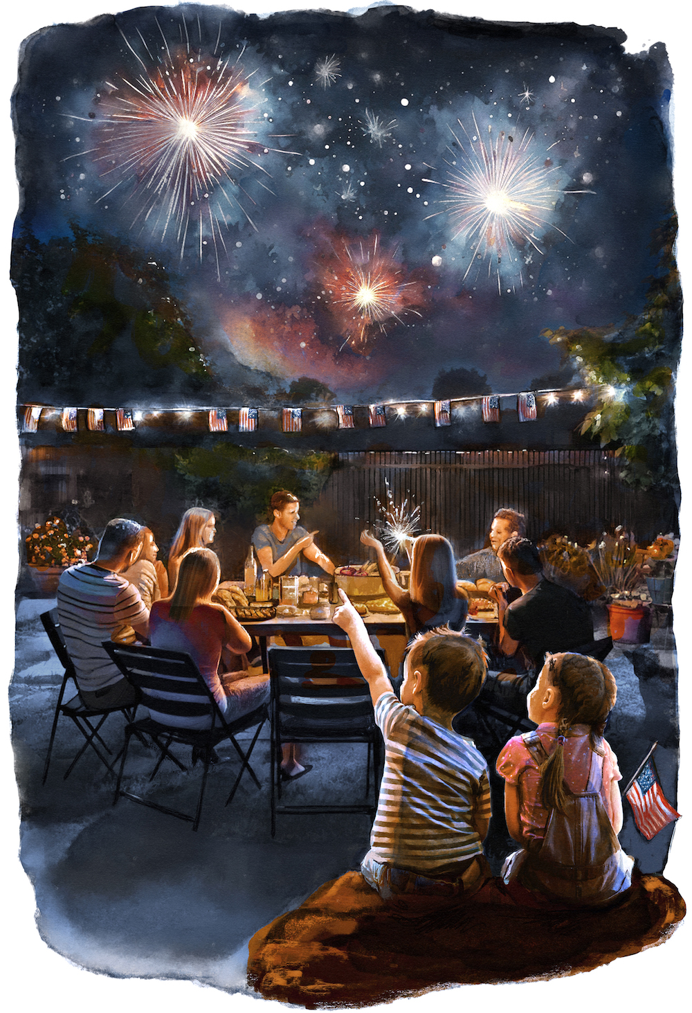 Hỏa tiễn đồ chơi, vải thêu kim tuyến, pháo hoa que, vòng pháo hoa, tất cả được phóng lên bầu trời đêm, sáng rực trong đêm tối với niềm hân hoan của các khán giả, một đài pháo hoa đón mừng Ngày Độc Lập. Ngoài cái tên không chính thức là Ngày Pháo hoa Hoa Kỳ, thì ngày 04/07 còn là kỳ nghỉ giữa hè, thời điểm mà các gia đình và bạn hữu quây quần bên những bữa tiệc nướng ở khoảng sân sau nhà, các buổi dã ngoại, và các buổi tiệc potluck, là lúc những đứa trẻ tung tăng trong ánh hoàng hôn trong khi người lớn thư giãn với đồ uống trên những chiếc ghế sân vườn, và các cuộc diễn hành, hòa nhạc bày tỏ lòng tôn kính đối với nền tự do của Mỹ quốc.