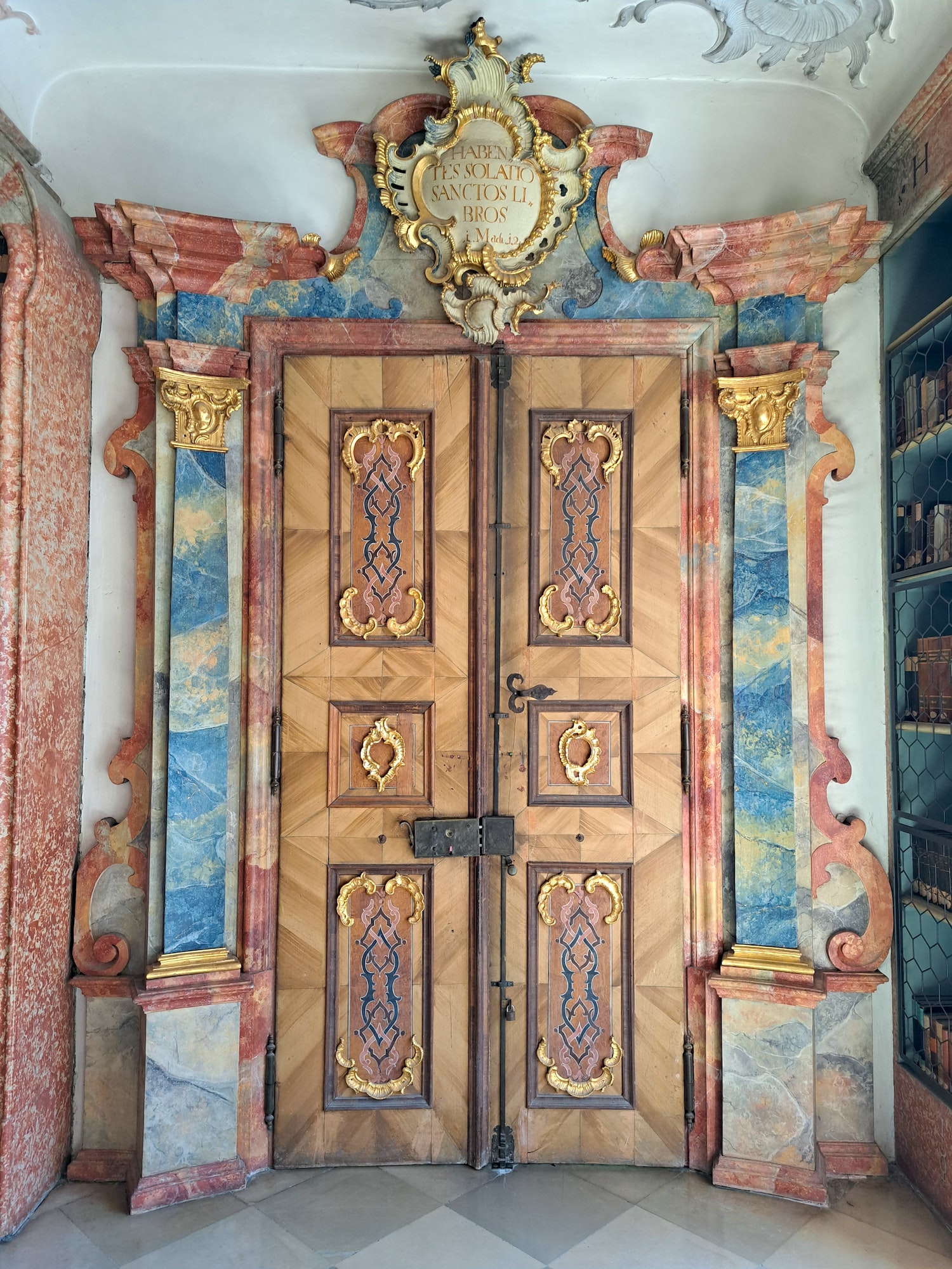 Chiếc cầu thang nối giữa tầng một và tầng hai của sảnh thư viện, và tầng trung tâm được bao quanh bởi tám bức tượng gỗ sơn do họa sĩ Dominikus Hermenegild Herberger điêu khắc. Các bức tượng này đại diện cho Luật học, Khoa học Tự nhiên, Toán học, Lịch sử, Sự Vâng phục, Buông bỏ Trần tục, Đức tin, và Cầu nguyện. Bên trên cửa ra vào là dòng chữ Latinh tôn vinh sự phong phú của thư viện, tạm dịch là: Nơi đây chứa đựng mọi kho báu trí tuệ và khoa học.