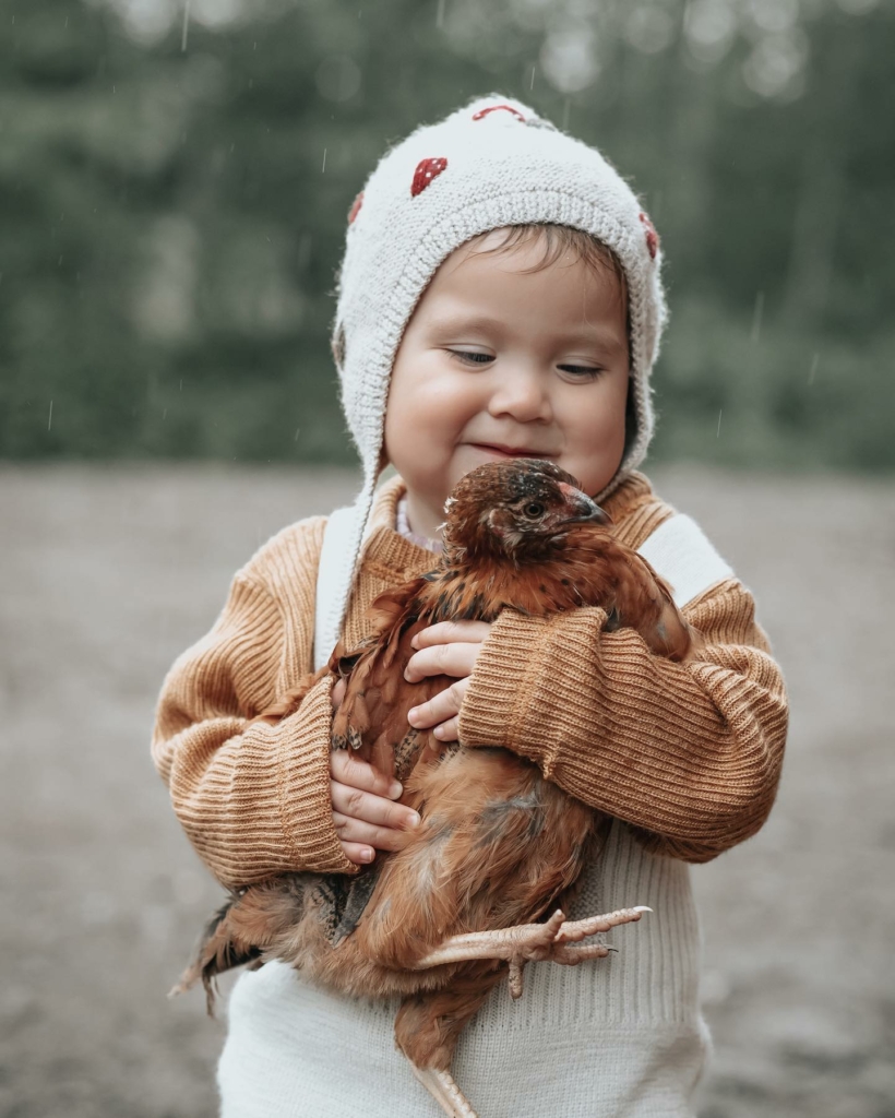 Một số người có lẽ nói đó chỉ là những con gà, nhưng bé Leo 1 tuổi đã dành trọn con tim yêu thương với những người bạn nhỏ có bộ lông tơ mịn màng này. Cô bé ôm ấp chú gà thật thân thiện, rõ ràng là cô bé rất yêu thương những động vật nhỏ bé và các chú gà cũng có vẻ rất hài lòng trong vòng tay nhỏ xíu và mũm mĩm của bé.