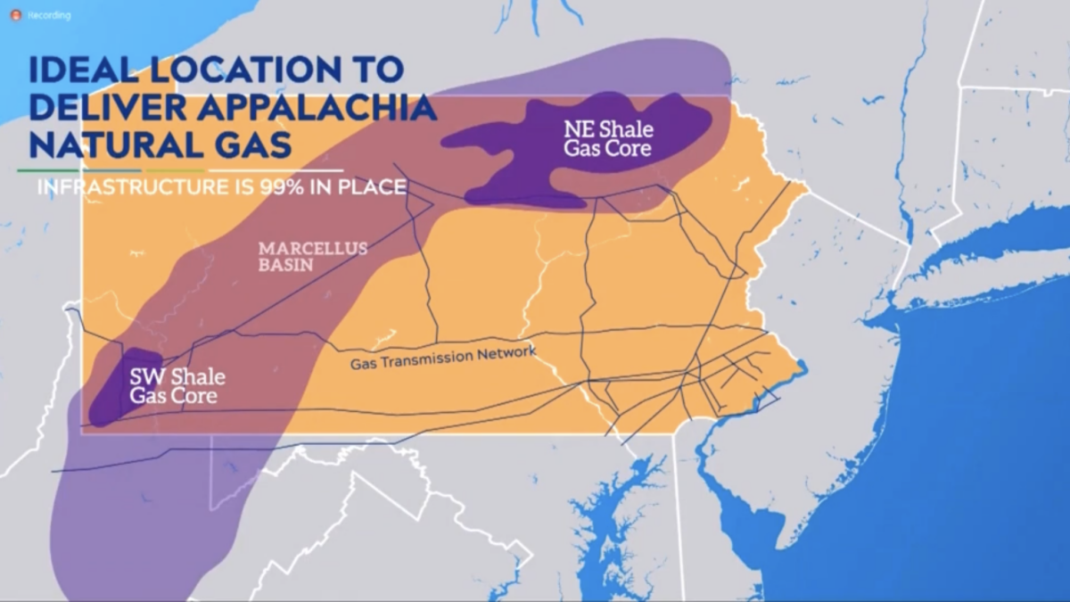 Pennsylvania là một địa điểm lý tưởng về mặt hậu cần, ông nói, bởi vì đây là nơi sản xuất khí đốt tự nhiên hàng đầu và đã có một mạng lưới đường ống dẫn khí đốt tự nhiên để vận chuyển từ các mỏ khí đốt đến bến, nơi khí đốt sẽ được làm mát và chuyển thành chất lỏng, chất lên tàu, và gửi đến khách hàng trên toàn thế giới.