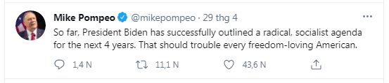 Ông Pompeo viết trên Twitter rằng, “Đến thời điểm này, TT Biden đã đề ra thành công một nghị trình xã hội chủ nghĩa cấp tiến cho 4 năm tới. Điều đó sẽ làm khổ mọi người dân Hoa Kỳ yêu tự do.” Trước đó, cựu ngoại trưởng đã làm dấy lên suy đoán cho rằng ông có thể ra tranh cử tổng thống vào năm 2024 nếu cựu Tổng thống Donald Trump quyết định không tranh cử nhiệm kỳ thứ hai.