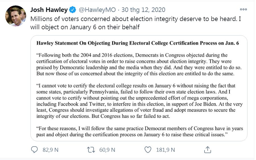 Thượng nghị sỹ Hawley viết trong một tuyên bố vào hôm 30/12: “Tôi không thể bỏ phiếu để chứng nhận kết quả cử tri đoàn vào ngày 06/01/2021 mà không nêu ra thực tế là một số tiểu bang, đặc biệt là Pennsylvania, đã không tuân theo luật bầu cử của tiểu bang của chính họ. Và tôi không thể bỏ phiếu để chứng nhận mà không chỉ ra nỗ lực chưa từng có của các tập đoàn lớn, bao gồm cả Facebook và Twitter, đã can thiệp vào cuộc bầu cử này, để trợ giúp cho ông Joe Biden,” ông nói thêm.