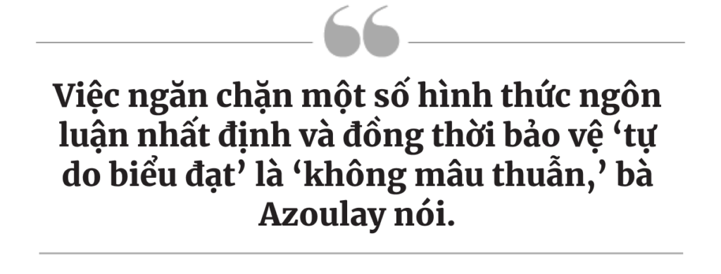 Khi đề cập đến báo cáo mới, có tiêu đề “Hướng dẫn Quản trị các Nền tảng Kỹ thuật số”, bà Azoulay nói rằng việc ngăn chặn một số hình thức ngôn luận nhất định và đồng thời bảo vệ “tự do biểu đạt” là “không mâu thuẫn.”