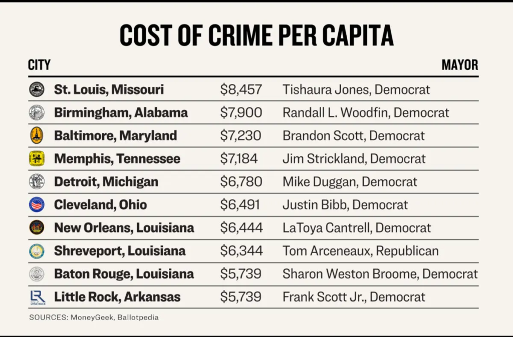 Các phân tích dữ liệu quốc gia mới nhất về tội phạm bạo lực và chi phí liên quan đến tội phạm cho thấy các thị trưởng Đảng Dân Chủ hiện đang phụ trách gần như toàn bộ 10 thành phố nguy hiểm nhất Hoa Kỳ.