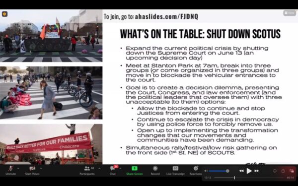 Trong đoạn phim của cuộc họp trực tuyến do The Epoch Times thu thập được, nhóm này đã thông báo rằng họ có kế hoạch phong tỏa cả ba lối đi dành cho xe cộ vào Pháp viện để các thẩm phán sẽ không thể đi vào và công bố một phán quyết có thể lật ngược án lệ Roe kiện Wade.