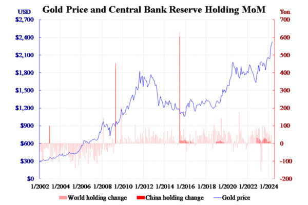 Biểu đồ dưới đây đặt diễn biến giá vàng song song với những thay đổi trong khối lượng vàng dự trữ của các ngân hàng trung ương từ tháng này qua tháng khác (MoM). Tuyên bố cho rằng việc các ngân hàng trung ương tăng khối lượng dự trữ là yếu tố thúc đẩy giá vàng lên cao dường như không thể hiện rõ ràng [trong biểu đồ này]. Kể từ đầu những năm 2010, các ngân hàng trung ương trên thế giới vẫn luôn đang tiến hành tăng đều đặn khối lượng dự trữ của họ, nhưng giá vàng lại [chỉ] trải qua sự gia tăng đột biến trong các năm 2019/2020 và 2023/2024.