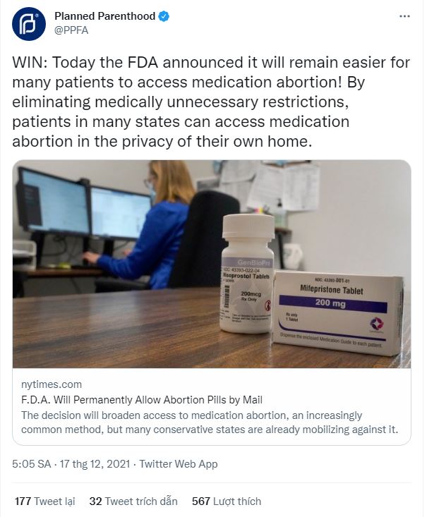 Tổ chức Kế hoạch hóa Gia đình cho biết trên Twitter, “Bằng cách loại bỏ các hạn chế không cần thiết về mặt y tế, bệnh nhân ở nhiều tiểu bang có thể tiếp cận việc phá thai bằng thuốc một cách kín đáo tại nhà riêng của mình.”