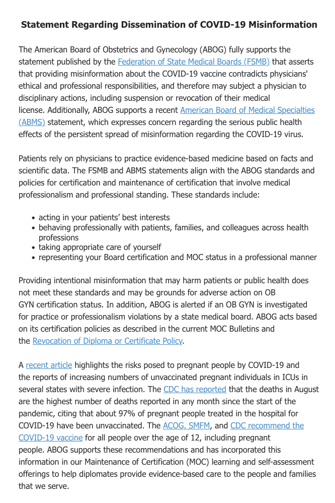 Bản tuyên bố viết: “Mới đây, Liên đoàn các Hội đồng Y tế Tiểu bang (FSMB) vốn hỗ trợ các hội đồng cấp phép y tế của các tiểu bang thành viên, đã đưa ra một tuyên bố cho rằng việc cung cấp thông tin sai lệch về vaccine COVID-19 mâu thuẫn với trách nhiệm đạo đức và nghề nghiệp của bác sĩ và do đó, bác sĩ có thể phải chịu các hành động kỷ luật, bao gồm đình chỉ hoặc thu hồi giấy phép hành nghề y tế. Chúng tôi thuộc Hội đồng Y học Gia đình Hoa Kỳ (ABFM), Hội đồng Nội khoa Hoa Kỳ (ABIM) và Hội đồng Nhi khoa Hoa Kỳ (ABP) ủng hộ quan điểm của FSMB. Chúng tôi cũng muốn tất cả các bác sĩ được hội đồng của chúng tôi chứng nhận biết rằng hành vi phi đạo đức hoặc không chuyên nghiệp đó có thể khiến hội đồng tương ứng của họ thực hiện hành động có khả năng khiến cho chứng nhận của họ gặp rủi ro.”