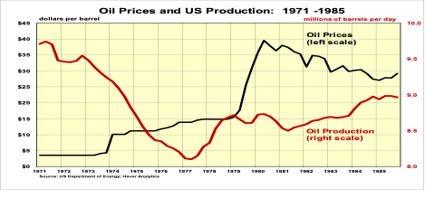 Lịch sử của giá dầu mỏ và khí đốt trong những năm 1970 là chỉ dẫn cho những gì đang xảy ra ngày nay. Biểu đồ sau đây cho thấy sản lượng dầu mỏ trong nước sụt giảm từ 9.7 triệu thùng/ngày năm 1971 xuống mức thấp 8.1 triệu năm 1977 như thế nào. Sự sụt giảm này khiến Hoa Kỳ phụ thuộc nhiều hơn vào nhập cảng. OPEC đã phản ứng với việc sản lượng giảm của Hoa Kỳ bằng cách tăng giá dầu mỏ, từ 4 USD/thùng lên 10 USD vào năm 1974. Các biện pháp kiểm soát giá đối với cả dầu mỏ và khí đốt tiếp tục hạn chế nguồn cung năng lượng của Hoa Kỳ trong suốt những năm 1970. Vào cuối thập niên này, trong một nỗ lực vô ích để giữ giá dầu ở mức thấp, việc kiểm soát giá trở nên gay gắt hơn và tình trạng thiếu hụt năng lượng càng trở nên nghiêm trọng hơn.