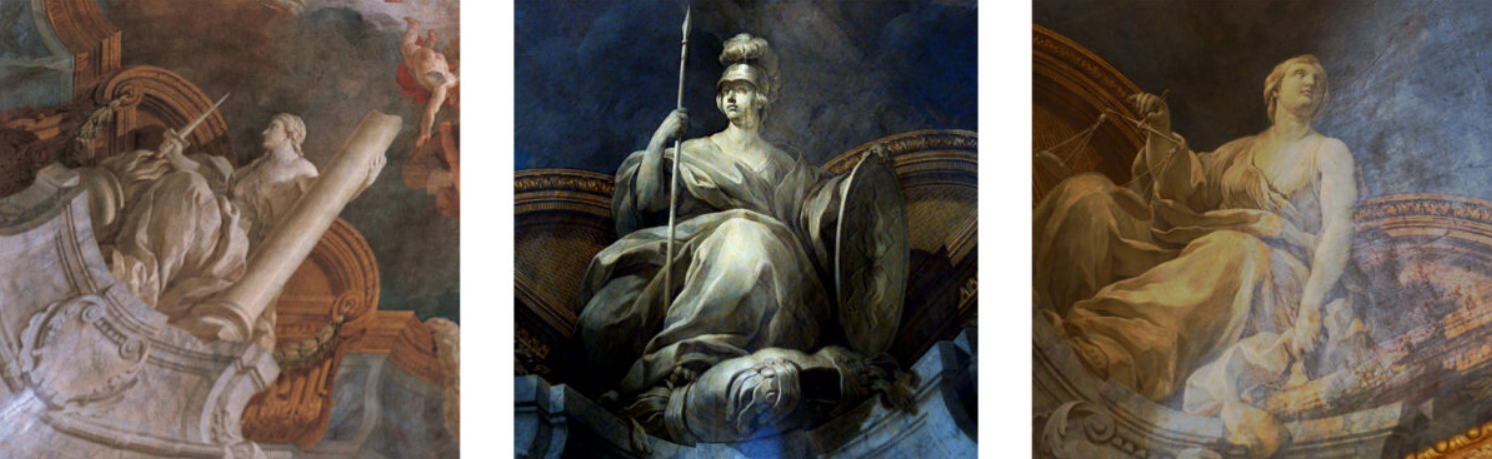 Các góc của trần nhà là bốn hình ảnh tượng trưng cho các đức tính tốt đẹp. Những giá trị này đại diện cho phẩm hạnh của người anh hùng là: Sức mạnh, Công lý, Tiết chế và Cẩn trọng. Bốn phẩm chất này là của Hercules triển hiện khi chàng phi thăng đến thiên đàng.