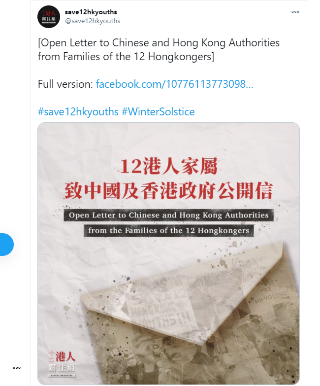 Hôm 21/12, gia đình của 12 nhà hoạt động Hồng Kông đã gửi một bức thư ngỏ tới các cơ quan chức năng ở Hồng Kông và Trung Quốc. Bức thư yêu cầu chính quyền Trung Cộng mở công khai phiên tòa xét xử 12 nhà hoạt động Hồng Kông sắp tới và phát sóng trực tuyến phiên tòa của họ trên web, đồng thời cho phép các luật sư do gia đình chỉ định bào chữa cho họ.