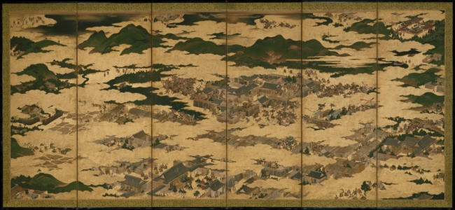 Hầu hết các bức tranh ở Kyoto cổ đều có dạng cuộn treo, cuốn và gấp. Các chủ đề đa dạng từ phong cảnh thanh bình đến những trận chiến hào hùng, từ cảnh sinh hoạt đời thường đến những giai thoại thú vị về những anh hùng. Một bức tranh gấp đầy ý nghĩa mô tả trận chiến của cuộc nổi loạn Hogen được vẽ rất công phu trên sáu bảng gỗ. Nó được vẽ vào thế kỷ 17 dù cuộc nổi loạn diễn ra vào thế kỷ 12. Mặc dù chỉ diễn ra vài giờ, cuộc nổi loạn Hogen đã có tác động sâu rộng đối với chính trị và xã hội thời bấy giờ, đánh dấu sự khởi đầu của thời kỳ trung cổ.