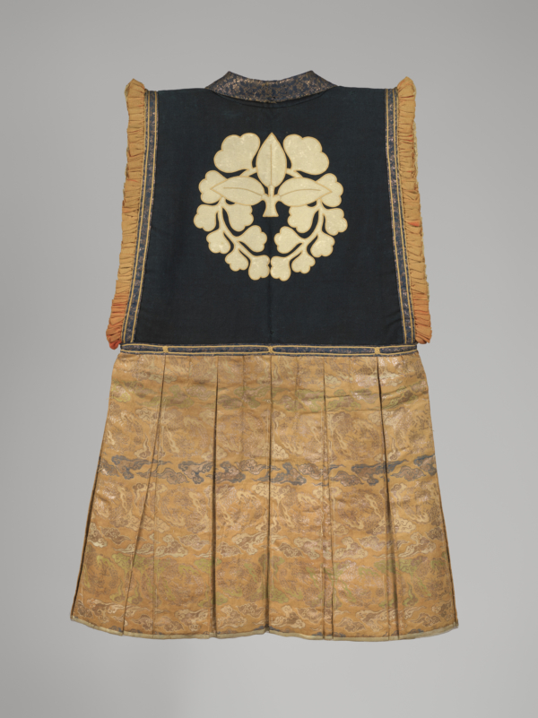 Triển lãm còn trưng bày một chiếc áo khoác sang trọng và thanh lịch thời kỳ Momoyama, còn gọi là “jinbaori”. Loại áo khoác này thường được mặc bên ngoài áo giáp để che mưa gió và khí lạnh. Một số đặc điểm cho thấy cách may áo chịu ảnh hưởng của phương Tây như cổ áo đứng với nhiều lớp lụa trắng và đỏ dọc theo các ống tay áo. Sự kết hợp độc đáo của các loại vải nhập khẩu xa xỉ và quý hiếm cho thấy chiếc áo này là một món quà của một lãnh chúa tặng cho samurai trung thành của mình.