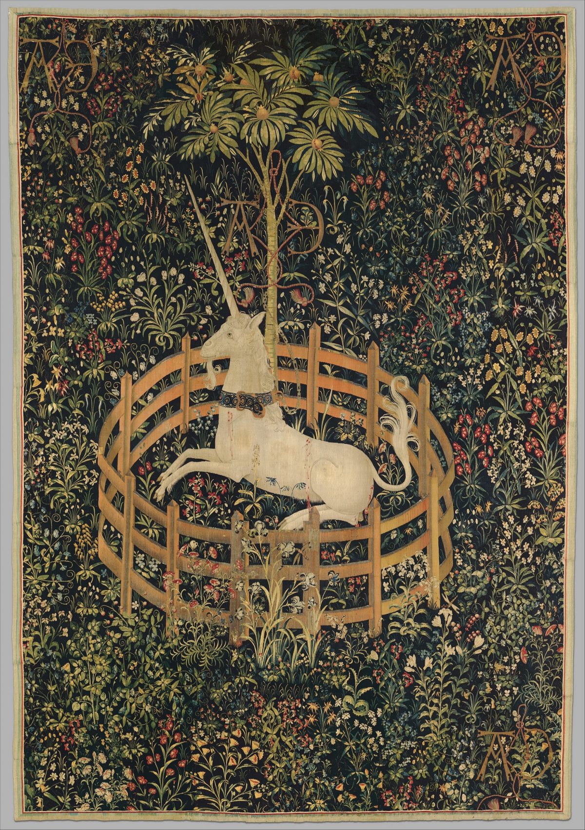 Trên cánh đồng cỏ ngàn hoa, một chú kỳ lân trầm tĩnh nằm nghỉ trong một hàng rào hình tròn màu vàng kim. Chú kỳ lân được buộc nhẹ vào thân cây lựu bằng sợi xích vàng nối với một chiếc vòng cổ sắc màu lộng lẫy. Cây lựu sai trĩu quả, một số trái có vẻ còn bị vỡ ra và nhỏ nước lên chú kỳ lân này tại ba vị trí khác nhau.