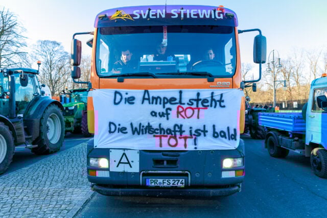 BERLIN — Vào đầu tuần lễ biểu tình của nông dân bắt đầu từ hôm 08/01, một sự kiện của nhóm “Nông dân Tự do” (Freien Bauern) đã diễn ra trước Cổng thành Brandenburg ở thủ đô Berlin của Đức. Tuy nhiên, không chỉ những người nông dân lái máy kéo mới tham gia biểu tình mà cả các công ty vận tải, công ty xây dựng, và thợ thủ công cũng đến ủng hộ. Qua những biểu ngữ họ muốn nói lên ý kiến của mình về vấn đề trước mắt.