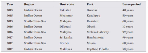 Các cảng quan trọng ở ngoại quốc liên quan đến các khoản đầu tư và khai thác của Trung Cộng –liên quan đến Con đường Tơ lụa Hàng hải, ban đầu tập trung vào việc tạo điều kiện thuận lợi cho thương mại với Hiệp hội các quốc gia Đông Nam Á (ASEAN) và sau đó là các quốc gia ở Nam Á và Đông Phi liên kết với Đông Nam Á, Nam Á và Trung Đông/Đông Phi thông thương các tuyến đường thương mại MSR. Mục tiêu chiến lược quan trọng là duy trì quyền kiểm soát của Trung Quốc đối với các cơ sở này trong nhiều thập niên thông qua các hợp đồng cho thuê dài hạn mà các quốc gia sẽ [phải] hoàn trả cho các khoản đầu tư cơ sở hạ tầng của Trung Cộng. Dưới đây là một hình ảnh tóm tắt quyền sở hữu được thuê của các cảng MSR chính ở Nam Á và Đông Nam Á từ một báo cáo của Viện Nghiên cứu Hòa bình Quốc tế Stockholm (SIPRI) :