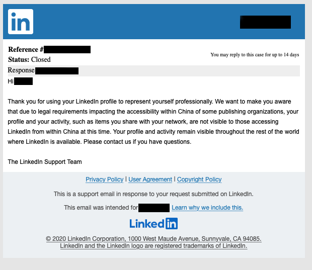 Trước chất vấn của The Epoch Times vào thời điểm đó, công ty cho biết “do các yêu cầu pháp lý địa phương ở Trung Quốc, hồ sơ và hoạt động của một số thành viên LinkedIn liên kết với các tổ chức xuất bản nhất định không được hiển thị ở Trung Quốc vào thời điểm này.”