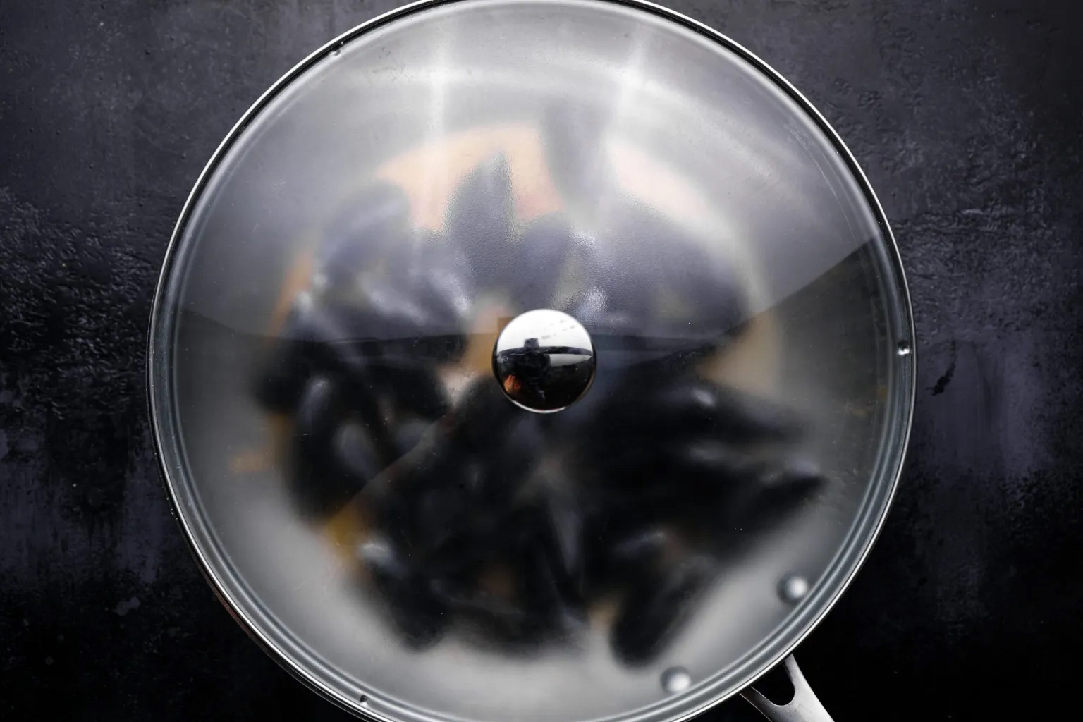 Trong chảo mà bạn vừa nấu tôm (không cần rửa lại trước), đun sôi rượu trên lửa vừa. Thêm vẹm vào và đậy nắp.