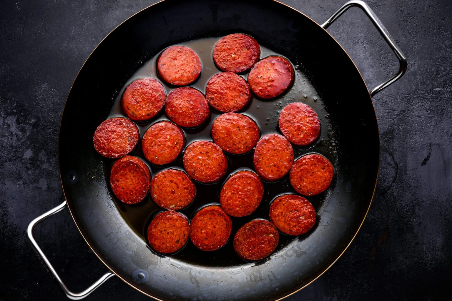 Trong chảo paella cỡ 33 cm, chảo gang tráng men lớn (như [của hãng] Le Creuset), hoặc chảo lớn, đun nóng 2 muỗng canh dầu trên lửa vừa. Rán xúc xích thịt heo xông khói đã cắt lát, trở mặt một lần, cho đến khi xúc xích có màu nâu nhạt và một ít chất béo chảy ra, khoảng 3 phút.