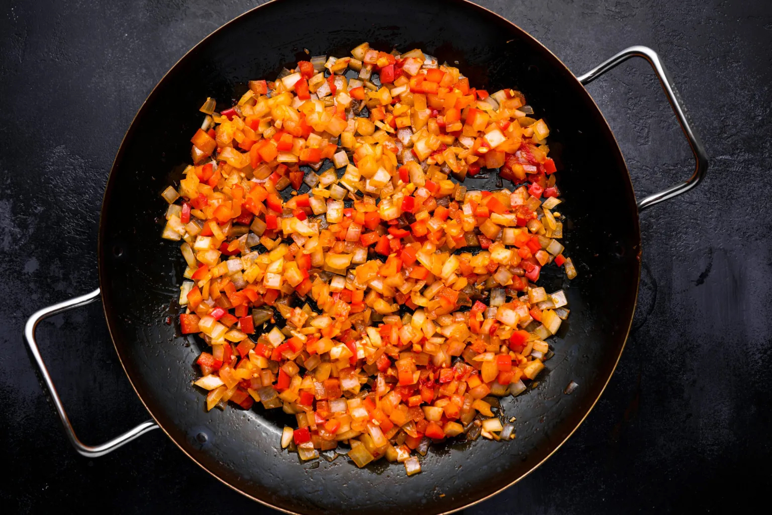 Trong chảo paella cỡ 33 cm, chảo gang tráng men lớn (như [của hãng] Le Creuset), hoặc chảo lớn, đun nóng 2 muỗng canh dầu trên lửa vừa. Nấu xúc xích thịt heo xông khói đã cắt lát, đảo một lần, cho đến khi có màu nâu nhạt và một ít chất béo chảy ra, khoảng 3 phút. Bạn sử dụng một cái muỗng có rãnh, chuyển chorizo đã ngả nâu vào đĩa và đặt sang một bên. Thêm hành tây và ớt chuông vào chảo và nấu, đảo thường xuyên, cho đến khi mềm, khoảng 5 phút. Thêm tỏi và nấu thêm 1 phút nữa. Cho vào sốt cà chua rồi trộn đều.