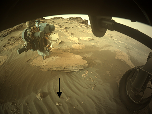 Hình ảnh cánh tay robot của Perseverance đang khảo sát một tảng đá tại một địa điểm thu thập mẫu quan trọng. Perseverance đang khám phá vùng châu thổ sông cổ đại cuối cùng trong miệng núi lửa Jezero, một vị trí đắc địa cho các dấu hiệu của sự sống vi sinh vật cổ đại. Các mẫu đá thu thập được dự kiến sẽ được đưa trở lại Trái Đất để nghiên cứu thêm trong tương lai.