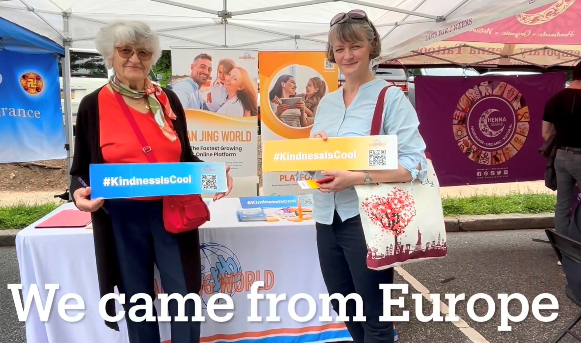 Hai người phụ nữ thanh lịch đến từ Châu Âu rất ủng hộ tôn chỉ “Sự tử tế thật tuyệt” của Gan Jing World. Họ đã chụp ảnh lưu niệm trước gian hàng.