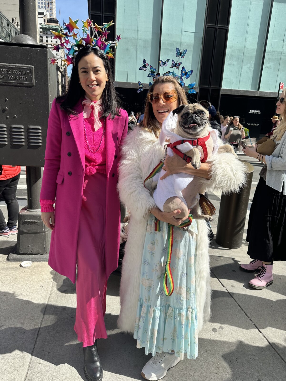 Đến từ Brazil, bà Enzo trang trí chiếc mũ của mình bằng hình những con bươm bướm và khoác cho chú chó của mình một bộ đồ thỏ Phục Sinh.