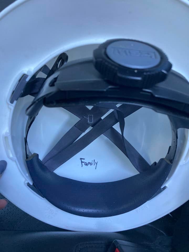 Mới đây, khi Jenn mượn xe tải của Jared để đi lấy nệm cho cậu con trai nhỏ, cô đã nhìn thấy chiếc nón bảo hộ của chồng được đặt lật ngửa trên ghế xe tải. Khi nhận thấy chữ gì đó được viết bên trong nón, cô đã leo vào trong xe tải để xem kỹ hơn và thấy dòng chữ “gia đình” được viết nhỏ nhắn bằng bút Sharpie.