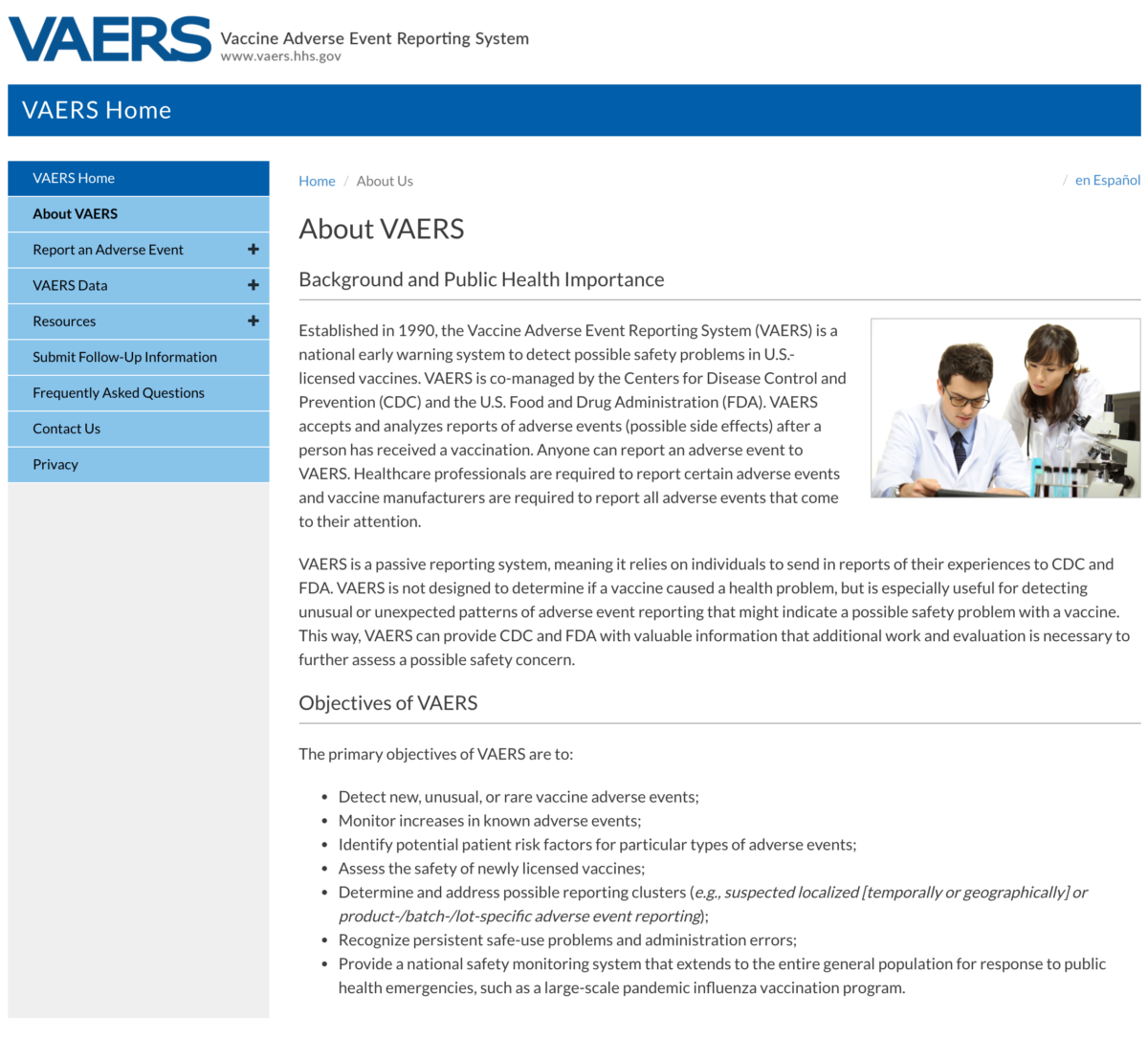 Hệ thống VAERS được đưa vào khai triển từ năm 1990 nhằm mục đích cung cấp một tín hiệu cảnh báo sớm rằng vaccine có thể có vấn đề. Bất kỳ ai cũng có thể gửi báo cáo, sau đó họ sẽ kiểm tra độ trùng lặp của những báo cáo này. Phần lớn các báo cáo được ghi nhận bởi nhân viên y tế, dựa trên nghiên cứu trước đó. Thông thường, sẽ có khoảng 40,000 báo cáo mỗi năm, trong đó có vài trăm trường hợp tử vong.