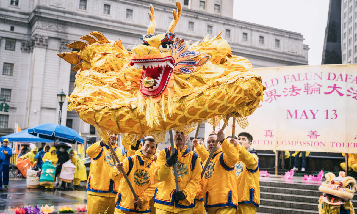 Các học viên Pháp Luân Công tham gia một sự kiện chào mừng Ngày Pháp Luân Đại Pháp Thế giới 13/05 tại Quảng trường Foley, New York, hôm 07/05/2022. (Ảnh: Samira Bouaou/The Epoch Times)