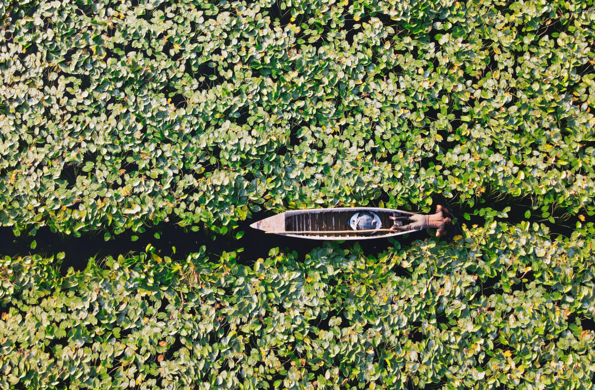 Ảnh chụp từ trên cao một ngư dân trên thuyền giữa những bông hoa súng ở Hồ Golbasi ở tỉnh Hatay, miền nam Thổ Nhĩ Kỳ hôm 17/08/2022. (Ảnh: Omar Jaj Kadour/AFP qua Getty Images)