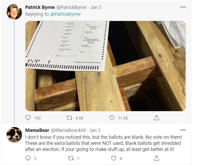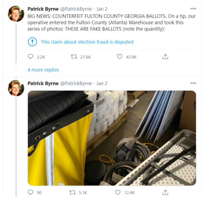Ông Patrick Byrne, người sáng lập đồng thời là cựu Giám đốc Điều hành của Overstock, đã tuyên bố trong một chuỗi các bài đăng trên Twitter vào ngày đầu năm mới rằng người ta đã tìm thấy “các lá phiếu giả” ở quận Fulton, bang Georgia.