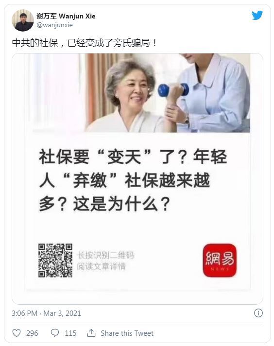 Cô Tiết cũng đề cập: “Khi các phương tiện truyền thông đại lục bắt đầu nói về sự cần thiết và lợi ích của việc mua BHXH, bất kỳ ai có đầu óc một chút cũng biết, điều gì đằng sau sự định hướng dư luận như vậy-lương hưu thực sự có một lỗ hổng lớn không thể lấp đầy. Vậy thì ai muốn hy sinh số tiền để sinh tồn của chính mình lấp đầy hố sâu không đáy do chính quyền tham nhũng tạo ra?”