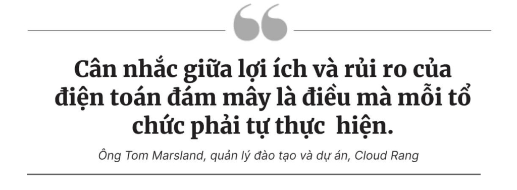 “Cân nhắc giữa lợi ích và rủi ro của điện toán đám mây là điều mà mỗi tổ chức phải tự thực hiện,” ông Marsland nói. “Đối với các tổ chức đang tìm kiếm một tệp khách hàng rộng hơn, thì lợi ích thật sự lớn hơn rủi ro—nhưng các tổ chức này có đủ khả năng để thuê các chuyên gia về bảo mật đám mây.”