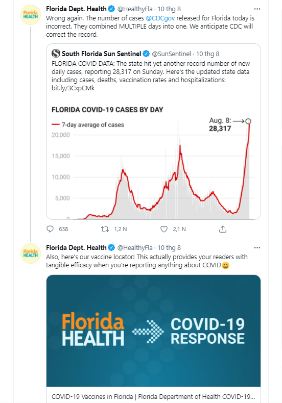 “Lại một sai lầm nữa. Số ca @CDCgov công bố cho Florida ngày hôm nay là không chính xác,” cơ quan này viết cho Sun-Sentinel. “Họ đã CỘNG DỒN NHIỀU ngày thành một ngày. Chúng tôi dự đoán CDC sẽ sửa lại báo cáo này.”