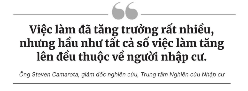 Tính đến tháng 03/2024, có tổng cộng 31 triệu lao động nhập cư, chiếm gần 20% lực lượng lao động của Hoa Kỳ. Ông Camarota ước tính rằng vào đầu năm nay, khoảng 9 triệu lao động trong số này là người nhập cư bất hợp pháp.