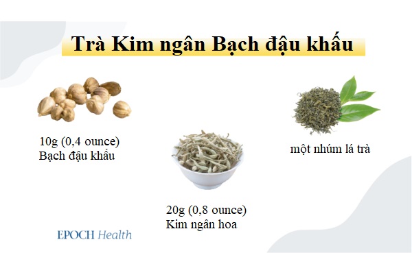 Cho 10g (0,4 ounce) Bạch đậu khấu, 20g (0,8 ounce) Kim ngân, và một ít lá trà vào bình giữ nhiệt. Rót nước sôi vào, đậy nắp, ngâm trà và uống. Trà Kim ngân Bạch đậu khấu sẽ làm giảm hoặc loại bỏ mùi hôi miệng.