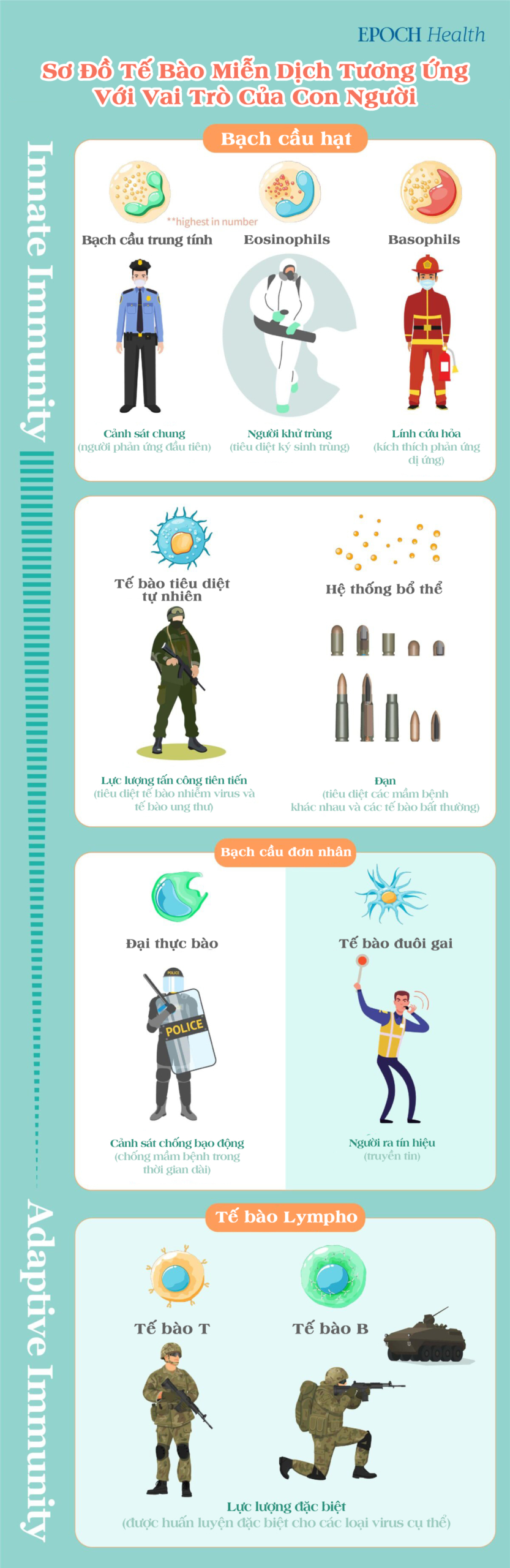 Hệ miễn dịch bẩm sinh sẽ tham gia chiến đấu đầu tiên khi gặp phải nguồn lây nhiễm không xác định. Đồng thời, hệ miễn dịch bẩm sinh còn có nhiệm vụ quan trọng là xác định danh tính của mầm bệnh và thông báo cho hệ miễn dịch thích ứng để điều binh nhanh chóng nhằm chống lại mầm bệnh. Những “lực lượng đặc biệt” này chủ yếu bao gồm các tế bào T và tế bào B.